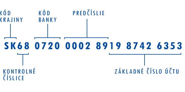 „Slovenský IBAN“ sa skladá z 24 alfanumerických znakov. Prvé dva znaky predstavujú kód krajiny (SK), ďalšie dva predstavujú kontrolné číslice, nasleduje štvormiestny kód banky (kód banky identifikuje konkrétneho poskytovateľa platobnej služby napr. kód NBS je 0720). IBAN ďalej tvorí predčíslie účtu a základné číslo účtu (tzv. národná časť IBAN).